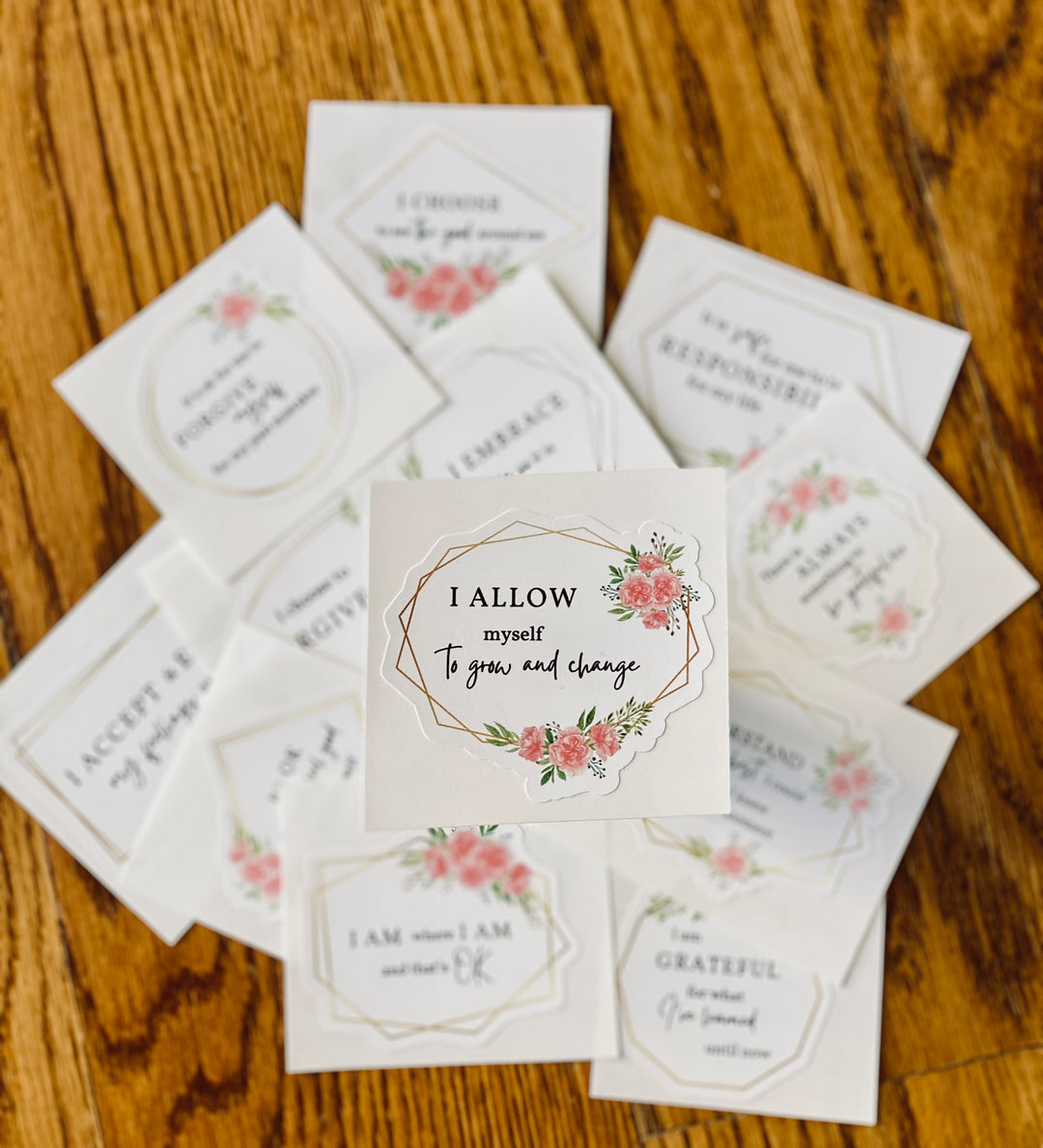 Beautifully designed clings focusing on areas like money, confidence, relationships, and body image. Place them around your home, on your fridge, or even in your car, and let them gently remind you of your journey towards positivity and self-acceptance.